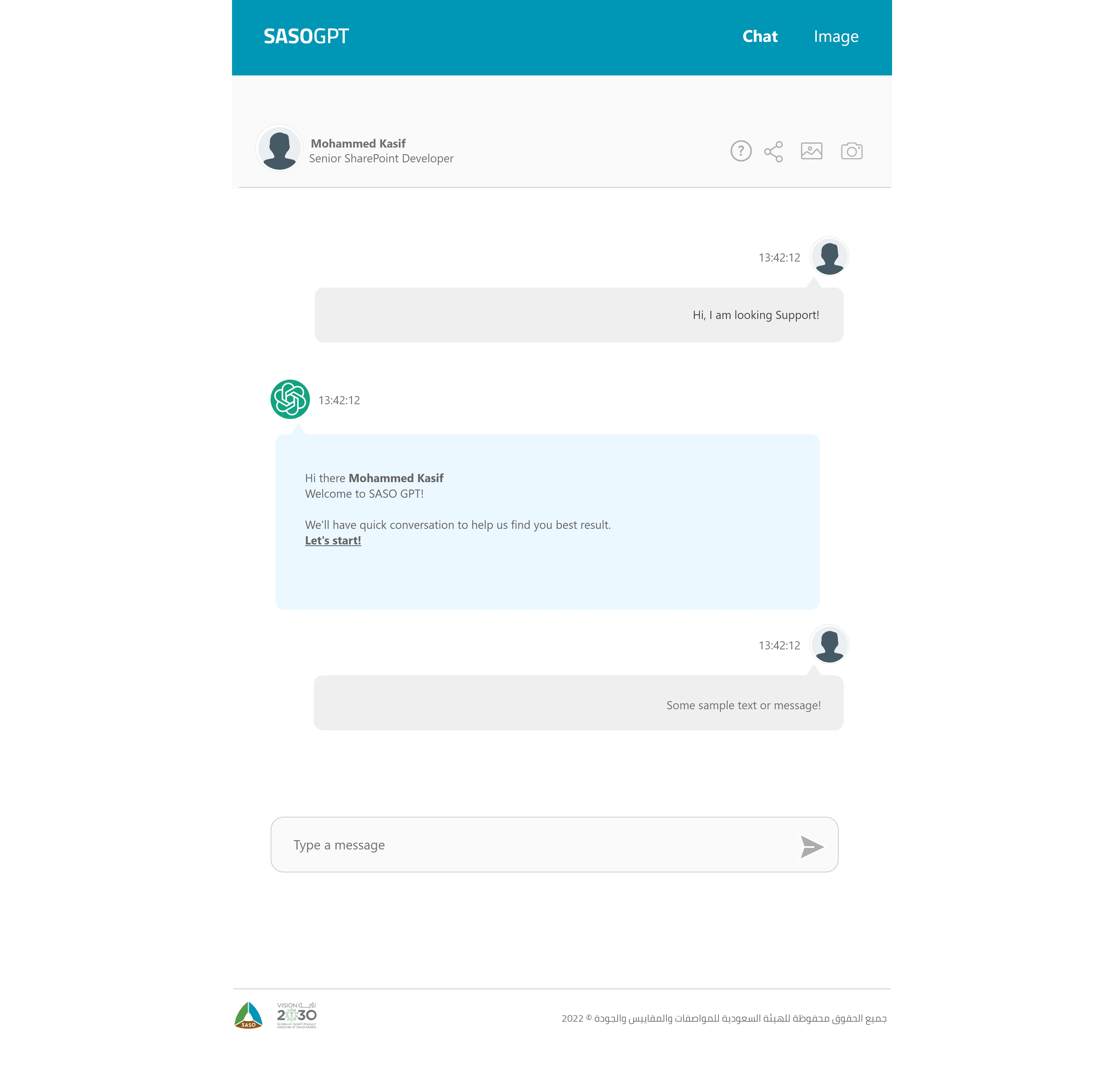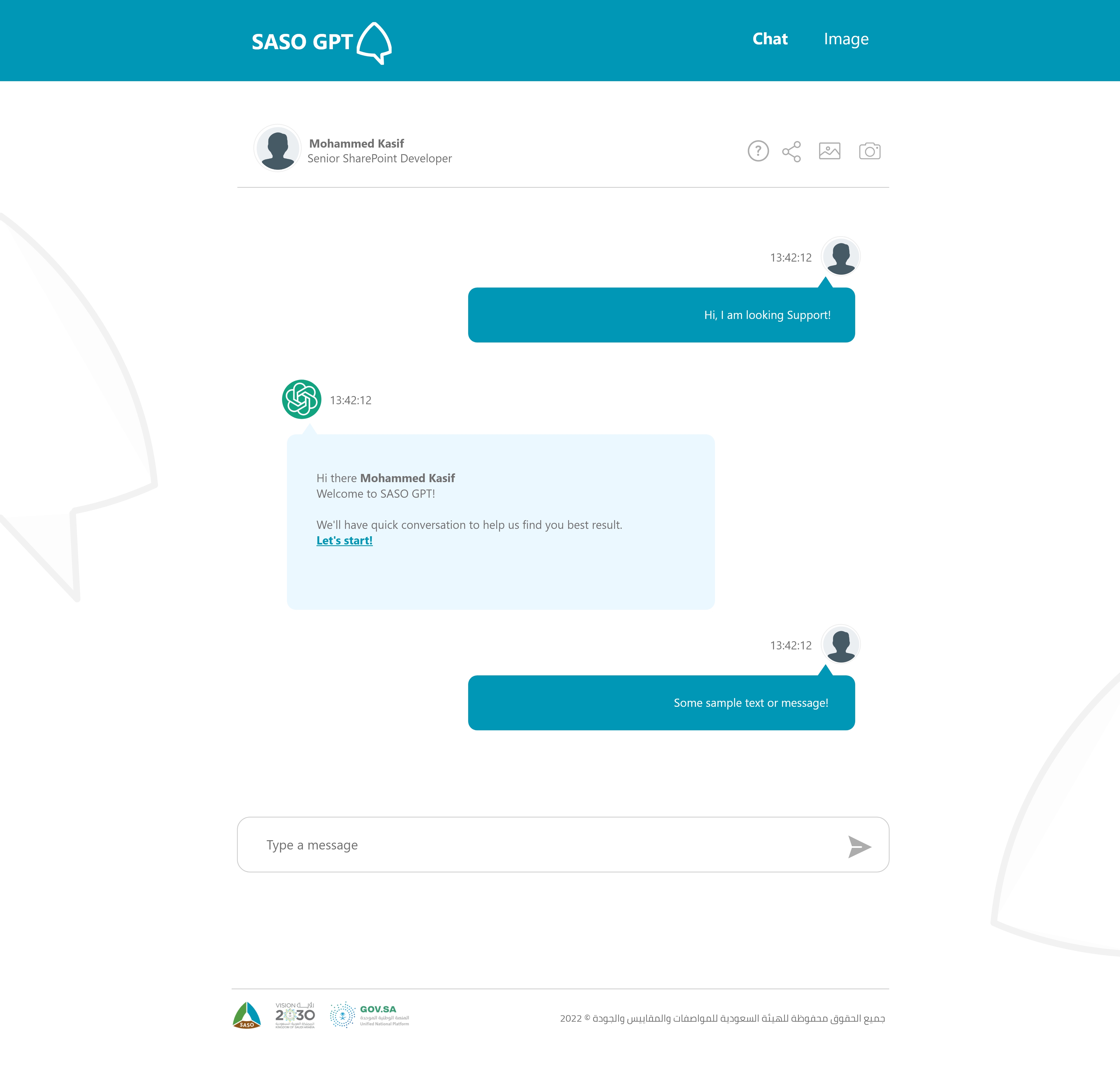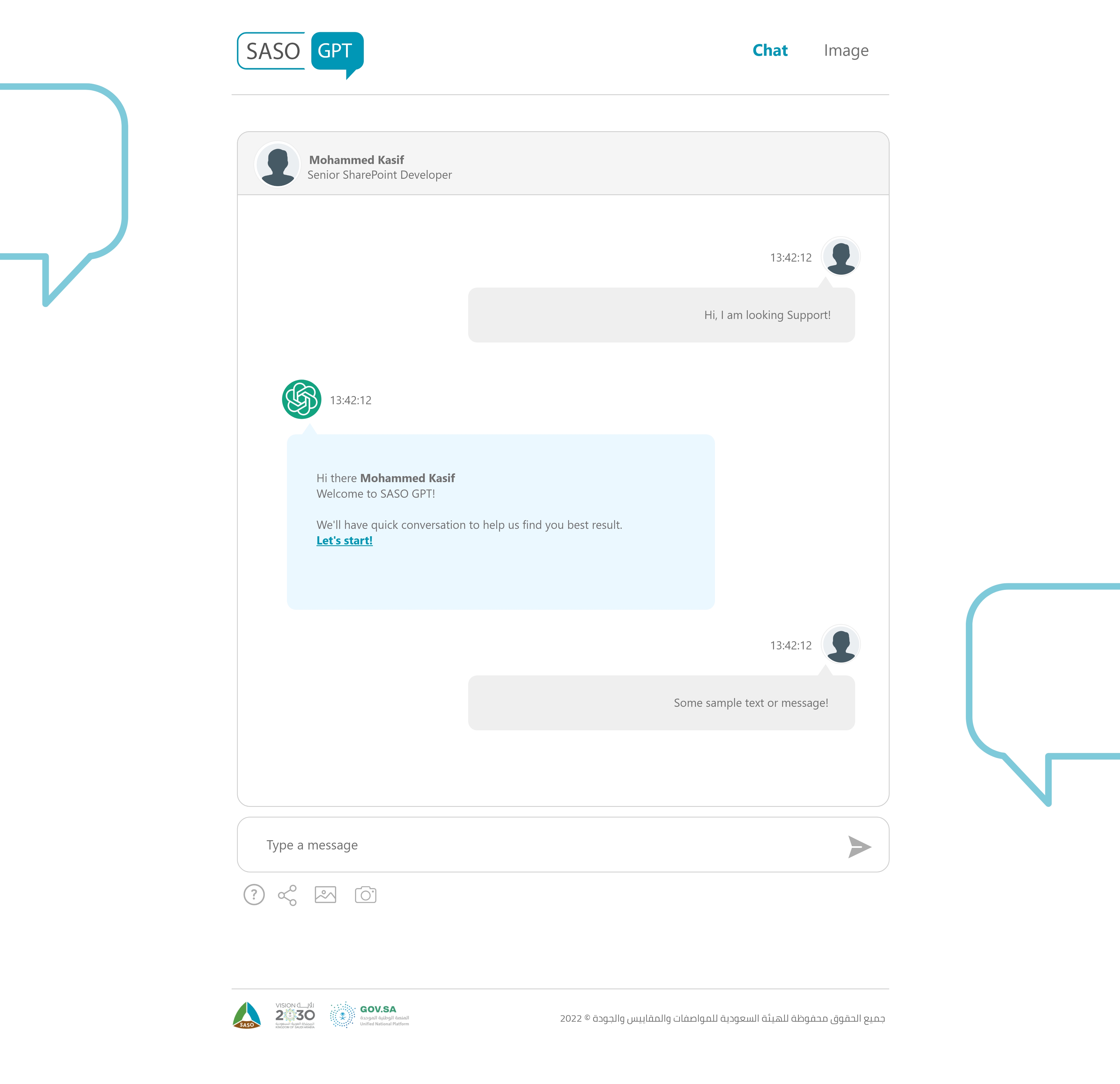 SASO ChatGPT is a custom AI chatbot interface designed specifically for the Saudi Standards organization, aiming to enhance user engagement and streamline access to regulatory information through an intuitive and accessible design.