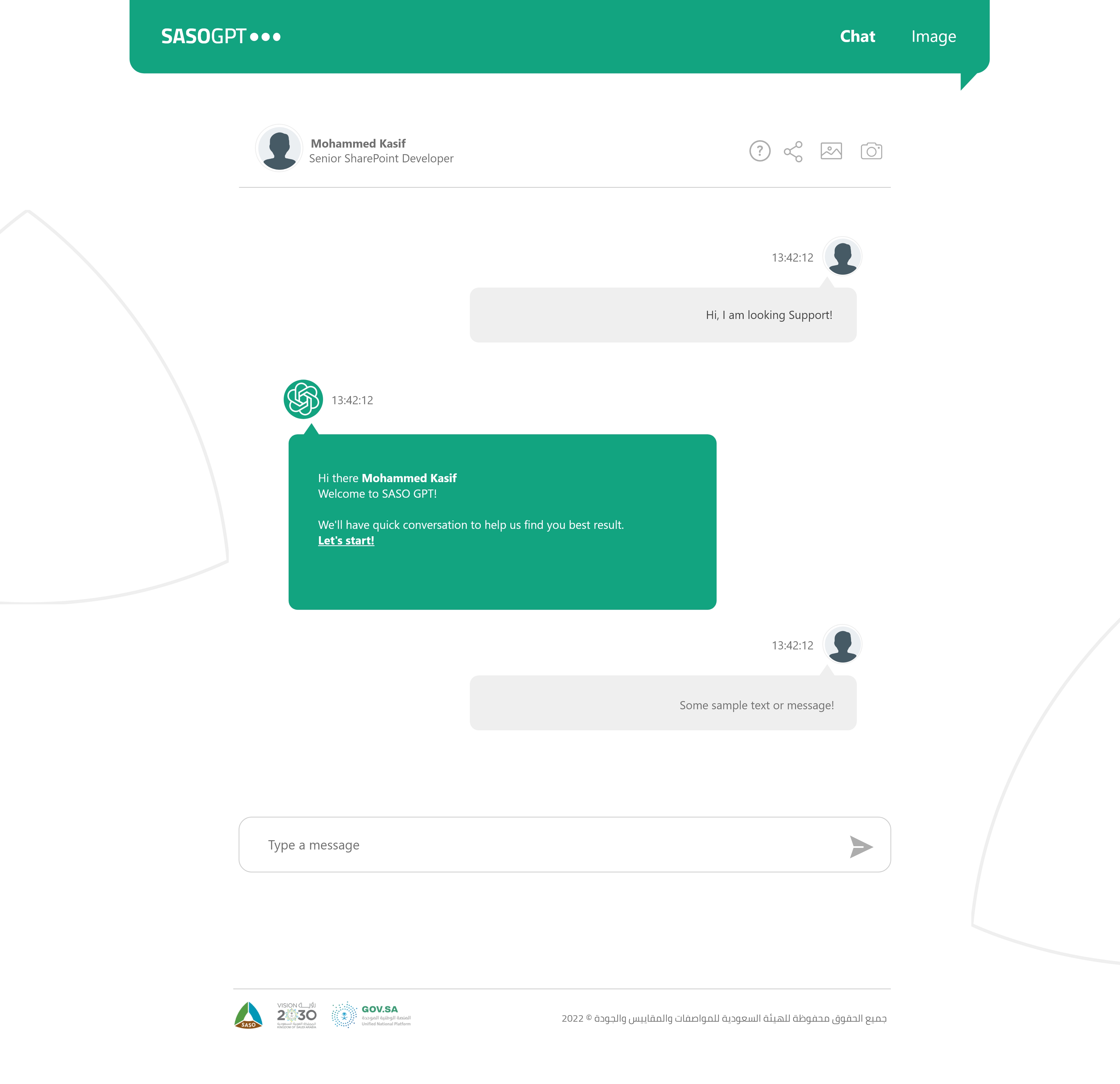 SASO ChatGPT is a custom AI chatbot interface designed specifically for the Saudi Standards organization, aiming to enhance user engagement and streamline access to regulatory information through an intuitive and accessible design.